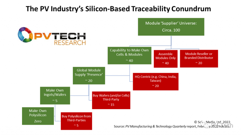 今天,在約100家銷(xiāo)售光伏組件的公司中,只有五家全球供應(yīng)商生產(chǎn)自己的硅錠、硅片、電池和組件。然而,這些公司中只有少受幾家自己生產(chǎn)多晶硅,而多晶硅正是2021年新疆問(wèn)題關(guān)注的價(jià)值鏈的一部分