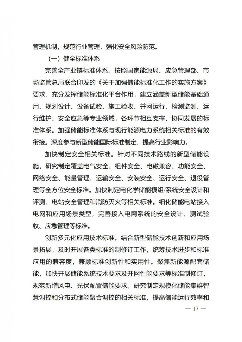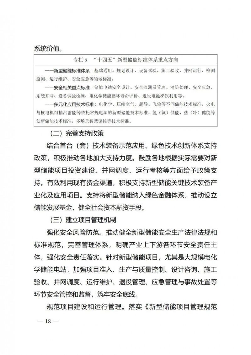 五是著力健全新型儲(chǔ)能管理體系?!秾?shí)施方案》強(qiáng)化標(biāo)準(zhǔn)的規(guī)范引領(lǐng)和安全保障作用,完善新型儲(chǔ)能全產(chǎn)業(yè)鏈標(biāo)準(zhǔn)體系,加快制定安全相關(guān)標(biāo)準(zhǔn),開(kāi)展多元化應(yīng)用技術(shù)標(biāo)準(zhǔn)制修訂。要求加快建立新型儲(chǔ)能項(xiàng)目管理機(jī)制,規(guī)范行業(yè)管理,強(qiáng)化安全風(fēng)險(xiǎn)防范。鼓勵(lì)各地加大新型儲(chǔ)能技術(shù)創(chuàng)新和項(xiàng)目建設(shè)支持力度,完善相關(guān)支持政策。加快建立新型儲(chǔ)能項(xiàng)目管理機(jī)制,強(qiáng)化安全風(fēng)險(xiǎn)防范,規(guī)范項(xiàng)目建設(shè)和運(yùn)行管理。