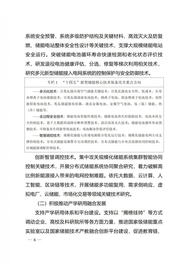 《實(shí)施方案》分為八大部分,包括總體要求、六項(xiàng)重點(diǎn)任務(wù)和保障措施。其中,六項(xiàng)重點(diǎn)任務(wù)分別從技術(shù)創(chuàng)新、試點(diǎn)示范、規(guī)模發(fā)展、體制機(jī)制、政策保障、國(guó)際合作等重點(diǎn)領(lǐng)域?qū)?ldquo;十四五”新型儲(chǔ)能發(fā)展的重點(diǎn)任務(wù)進(jìn)行部署。