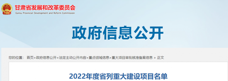 近日,甘肅省發(fā)改委公布了甘肅省2022年度省列重大建設項目名單,共234個項目,其中計劃新開工項目80個,續(xù)建項目138個,預備項目16個。