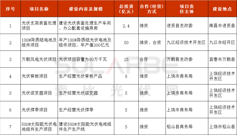 其中7個光伏項目入冊,分別是:南昌市進賢縣光伏支架表面處理項目、九江市經(jīng)開區(qū)年產(chǎn)10GW異質(zhì)結(jié)光伏電池及組件項目、宜春市萬載縣風電光伏項目(光伏項目容量為80萬千瓦)、上饒經(jīng)濟技術(shù)開發(fā)區(qū)光伏背板項目、光伏逆變器項目、光伏焊帶項目以及上饒市鉛山縣50GW太陽能光伏電池組件生產(chǎn)等7個項目。