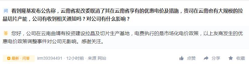 6日,針對(duì)“云南省發(fā)改委取消了其在云南省享有的優(yōu)惠電價(jià)及措施,貴司在云南也有大規(guī)模的拉晶切片產(chǎn)能,公司有收到相關(guān)通知嗎?對(duì)公司有什么影響?”的提問(wèn),晶澳科技在投資者互動(dòng)平臺(tái)回應(yīng)稱,“公司在云南曲靖有投資建設(shè)拉晶及切片生產(chǎn)基地,電費(fèi)執(zhí)行的是‘市場(chǎng)化電價(jià)政策’,隆基股份發(fā)生的優(yōu)惠電價(jià)政策調(diào)整事件對(duì)公司沒(méi)有影響。”