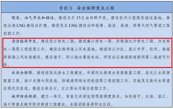 根據(jù)《實施方案》,北部灣城市群將開展安全保障重點工程,其中,清潔能源開發(fā)方面,將建設昌江核電二期,推進廉江核電一期、防城港紅沙核電三期、白龍核電一期等工程前期工作。建設北部灣海上風電基地,推進陽江沙扒、湛江外羅、欽州、海南西部海上風電場建設。建設南寧、陽江抽水蓄能電站,研究論證海南跨海聯(lián)網(wǎng)第二通道可行性。