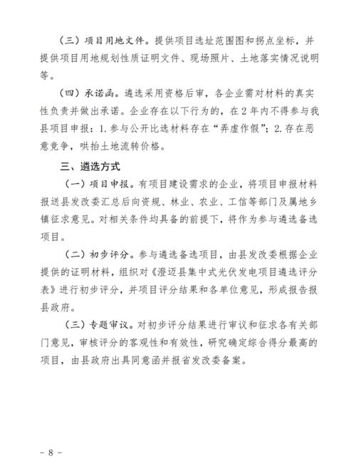 文件規(guī)定了澄邁縣集中式光伏發(fā)電項目應納入省內“十四五”能源發(fā)展規(guī)劃總規(guī)模,在全縣范圍內實行總量控制,每年新增建設的集中式光伏發(fā)電項目總規(guī)模原則上不超過10萬千瓦。對有建設需求的企業(yè),向縣發(fā)改委集中進行申報,通過組織比選的方式遴選綜合評價最高的項目實施。