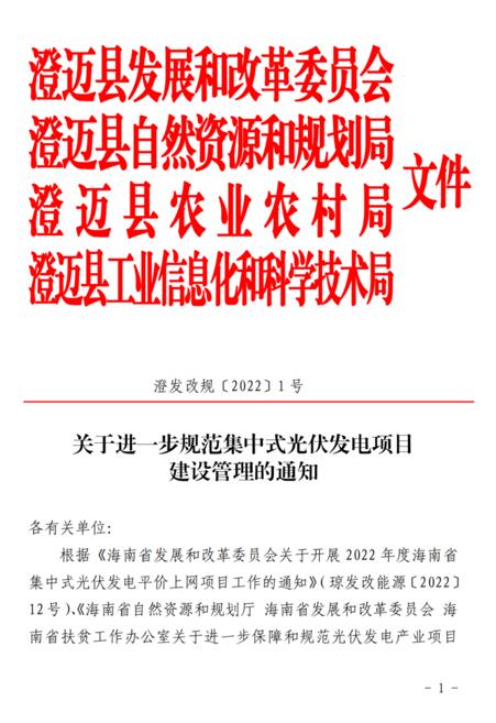 4月11日,澄邁縣發(fā)展和改革委員會、澄邁縣自然資源和規(guī)劃局、澄邁縣農業(yè)農村局、澄邁縣工業(yè)信息化和科學技術局聯合發(fā)布了《關于進一步規(guī)范集中式光伏發(fā)電項目建設管理的通知》。本通知自2022年5月12日起施行,有效期2年。