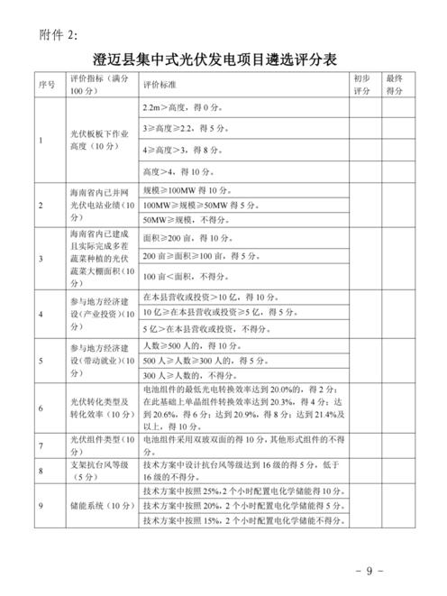 此外,根據澄邁縣集中式光伏發(fā)電項目遴選評分表,在澄邁縣營收或投資>10億,得10分;10億≥在本縣營收或投資≥5億,得5分;5億>在本縣營收或投資,不得分。配套儲能系統包括,技術方案中按照25%,2個小時配置電化學儲能得10分。按照20%,2個小時配置電化學儲能得5分。按照15%,2個小時配置電化學儲能不得分。