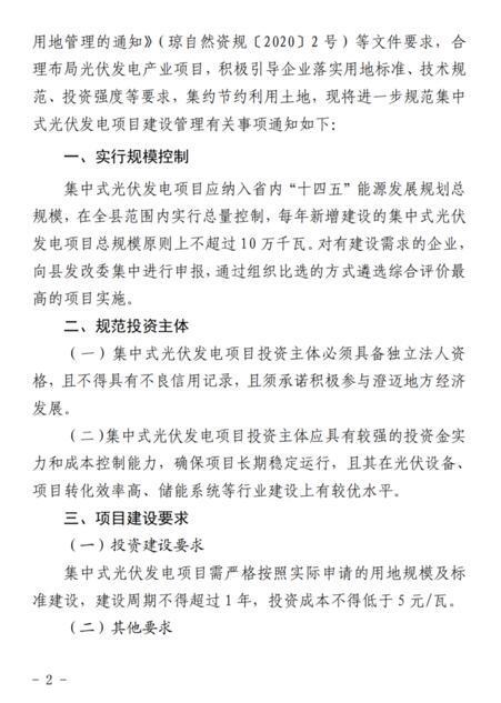項目投資建設要求中,集中式光伏發(fā)電項目需嚴格按照實際申請的用地規(guī)模及標準建設,建設周期不得超過1年,投資成本不得低于5元/瓦。