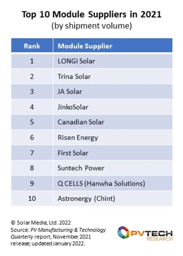 2022年一季度全球光伏組件供應商排行榜揭曉!這家中國企業(yè)重返全球第一