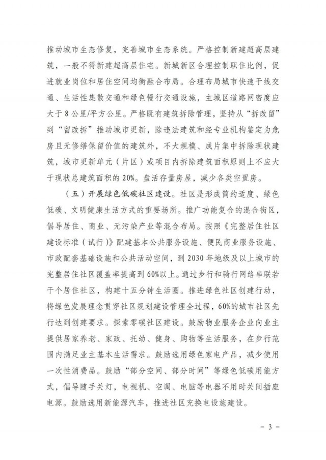 《方案》提出開展綠色低碳社區(qū)建設(shè)。推廣功能復(fù)合的混合街區(qū),倡導(dǎo)居住、商業(yè)、無污染產(chǎn)業(yè)等混合布局。按照《完整居住社區(qū)建設(shè)標(biāo)準(zhǔn)(試行)》配建基本公共服務(wù)設(shè)施、便民商業(yè)服務(wù)設(shè)施、市政配套基礎(chǔ)設(shè)施和公共活動空間,到2030年地級及以上城市的完整居住社區(qū)覆蓋率提高到60%以上。通過步行和騎行網(wǎng)絡(luò)串聯(lián)若干個居住社區(qū),構(gòu)建十五分鐘生活圈。推進(jìn)綠色社區(qū)創(chuàng)建行動,將綠色發(fā)展理念貫穿社區(qū)規(guī)劃建設(shè)管理全過程,60%的城市社區(qū)先行達(dá)到創(chuàng)建要求。探索零碳社區(qū)建設(shè)。鼓勵物業(yè)服務(wù)企業(yè)向業(yè)主提供居家養(yǎng)老、家政、托幼、健身、購物等生活服務(wù),在步行范圍內(nèi)滿足業(yè)主基本生活需求。鼓勵選用綠色家電產(chǎn)品,減少使用一次性消費品。鼓勵“部分空間、部分時間”等綠色低碳用能方式,倡導(dǎo)隨手關(guān)燈,電視機(jī)、空調(diào)、電腦等電器不用時關(guān)閉插座電源。鼓勵選用新能源汽車,推進(jìn)社區(qū)充換電設(shè)施建設(shè)。