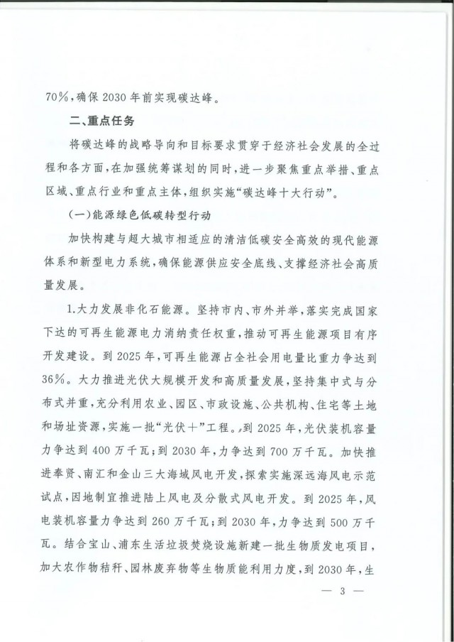 能源綠色低碳轉(zhuǎn)型行動提出,到2025年,可再生能源占全社會用電量比重力爭達到36%。堅持集中式與分布式并重,實施一批“光伏+“工程。到2025年,光伏裝機容量力爭達到400萬千瓦;到2030年,力爭達到700萬千瓦。加快推進奉賢、南匯和金山三大海域風電開發(fā),探索實施深遠海風電示范試點,因地制宜推進陸上風電及分散式風電開發(fā)。到2025年,風電裝機容量力爭達到260萬千瓦;到2030年,力爭達到500萬千瓦。結(jié)合寶山、浦東生活垃圾焚燒設施新建一批生物質(zhì)發(fā)電項目,到2030年,生物質(zhì)發(fā)電裝機容量達到84萬千瓦。