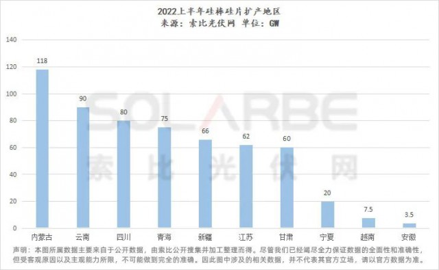 從擴(kuò)產(chǎn)地區(qū)來(lái)看,與硅料大同小異,硅棒硅片擴(kuò)產(chǎn)地區(qū)也較多集中于內(nèi)蒙古、云南、四川、新疆、青海等地。