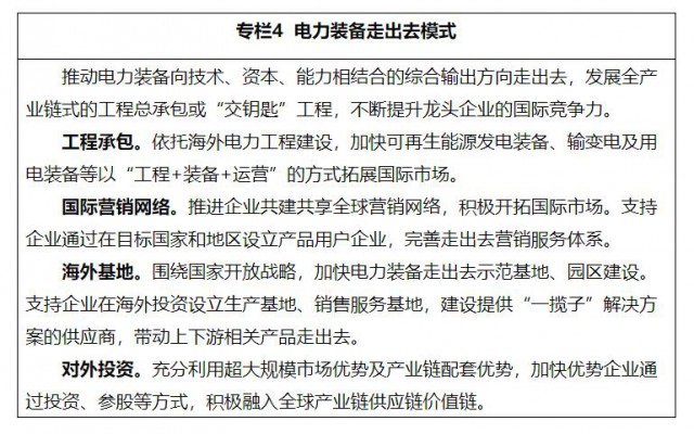 16.推動(dòng)電力裝備走出去。緊緊圍繞高質(zhì)量共建“一帶一路”、深入實(shí)施《區(qū)域全面經(jīng)濟(jì)伙伴關(guān)系協(xié)定》,鼓勵(lì)優(yōu)勢電力裝備企業(yè)以多種方式加快走出去。引導(dǎo)企業(yè)取得國際認(rèn)可的服務(wù)資質(zhì),帶動(dòng)技術(shù)、裝備、標(biāo)準(zhǔn)和服務(wù)走出去。支持行業(yè)組織搭建走出去信息綜合服務(wù)平臺,提供法律、咨詢、風(fēng)險(xiǎn)評估等服務(wù)。