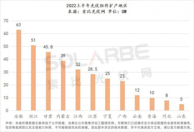 據(jù)索比光伏網(wǎng)統(tǒng)計,上半年電池組件擴產合計超650GW,其中電池擴產規(guī)模292.5GW,組件擴產規(guī)模360.5GW,均大幅超出終端市場需求。隆基(66GW)、晶科(52GW)、晶澳(36GW)、東方希望(35GW)、東方日升(30GW)等企業(yè)領銜擴產。從擴產地區(qū)來看,電池擴產主要集中在四川、江蘇、內蒙古、浙江、安徽等地,而組件擴產主要集中在安徽、浙江、甘肅、內蒙古、江西等地。