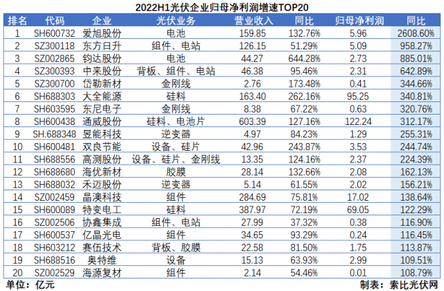 利潤(rùn)增速方面,除了硅料企業(yè)延續(xù)高增長(zhǎng)以外,去年因硅料價(jià)格暴漲而出現(xiàn)虧損的產(chǎn)業(yè)鏈中游專業(yè)化廠商,2022年上半年受益于供應(yīng)鏈管理能力的提升以及產(chǎn)品結(jié)構(gòu)的優(yōu)化,紛紛迎來(lái)困境翻轉(zhuǎn),其中愛(ài)旭股份、東方日升、中來(lái)股份的利潤(rùn)增速分別達(dá)到2609%、958%和643%。此外,岱勒新材、東尼電子兩大金剛線廠商受益于硅片環(huán)節(jié)的擴(kuò)產(chǎn)以及細(xì)線化發(fā)展趨勢(shì),疊加自身的產(chǎn)能擴(kuò)張和成本下降,利潤(rùn)增速均超300%。