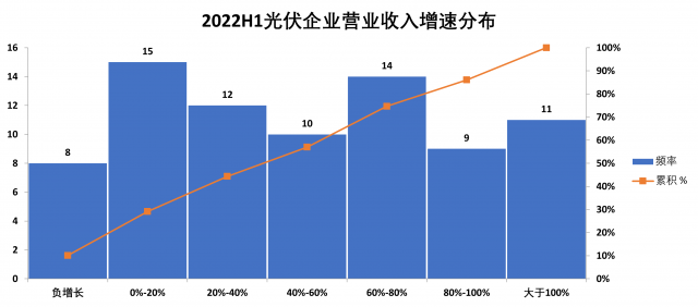 2022年上半年,79家光伏企業(yè)合計(jì)創(chuàng)收5571億元,平均增速(“平均”指“中位數(shù)”,下同)達(dá)到48%。令人欣喜的是,營(yíng)收負(fù)增長(zhǎng)的企業(yè)占比僅為10%,而營(yíng)收增速超過(guò)40%的企業(yè)占比則高達(dá)71%。其中,除了硅料企業(yè)繼續(xù)保持高速增長(zhǎng)以外,眾多“跨界者”也乘著光伏行業(yè)的“東風(fēng)”,迎來(lái)暴發(fā)式增長(zhǎng)。