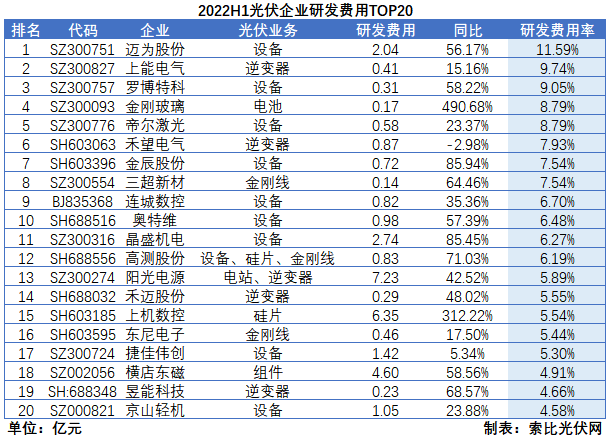 當(dāng)然,N型電池技術(shù)之所以能夠不斷取得突破性進(jìn)展,離不開(kāi)生產(chǎn)設(shè)備的持續(xù)升級(jí)與迭代。在研發(fā)費(fèi)用率排名中,前20位中有10家是設(shè)備廠商,其中HJT設(shè)備龍頭邁為股份的研發(fā)費(fèi)用率更是高達(dá)11.59%。在近期的中報(bào)業(yè)績(jī)交流會(huì)中,邁為股份表示預(yù)計(jì)今年下半年HJT組件成本能夠與PERC組件持平,至2023年HJT電池片成本優(yōu)勢(shì)將會(huì)逐步顯現(xiàn)。