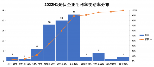 雖然2022年上半年光伏行業(yè)依然延續(xù)了高速增長(zhǎng)態(tài)勢(shì),多數(shù)光伏企業(yè)也取得了不錯(cuò)的經(jīng)營(yíng)業(yè)績(jī),但受到原材料價(jià)格大幅上漲、供需關(guān)系變化以及市場(chǎng)競(jìng)爭(zhēng)加劇等因素的影響,多數(shù)光伏企業(yè)的毛利率相比于去年同期均出現(xiàn)了不同程度的下滑。根據(jù)索比光伏網(wǎng)的統(tǒng)計(jì),79家光伏企業(yè)的毛利率平均降幅達(dá)到8.94%,而降幅超過(guò)20%的企業(yè)占比更是高達(dá)34%。