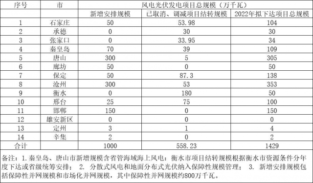 根據(jù)公示的2022年風(fēng)光開(kāi)發(fā)建設(shè)規(guī)模表,河北省2022年擬下達(dá)風(fēng)光項(xiàng)目14.29GW,分布在石家莊、承德、張家口、秦皇島等14個(gè)市。其中,已取消、調(diào)減項(xiàng)目結(jié)轉(zhuǎn)規(guī)模5.58GW,新增規(guī)模規(guī)模為10GW。