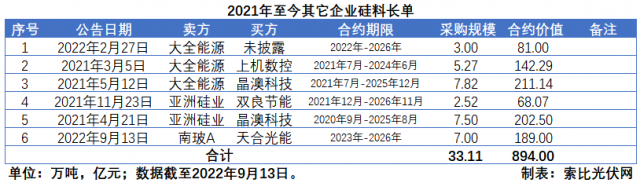 除了硅料三巨頭以外,大全能源、亞洲硅業(yè)兩大老牌硅料廠商分別取得了規(guī)模達到16.09萬噸和10.02萬噸、合約價值434.43億元和270.57億元的長單。而就在昨天,南玻集團宣布與天合光能達成價值212.10億元的4年7萬噸長約。