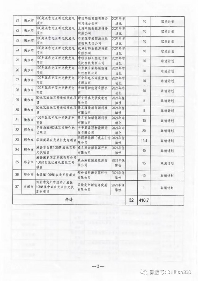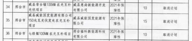 根據(jù)文件來看,相比此前發(fā)布的《風(fēng)電、光伏發(fā)電項目擬調(diào)整情況公示》來看,光伏新增取消三個2021年光伏保障性項目指標(biāo),規(guī)模總計為350MW,風(fēng)電則未發(fā)生變化。需要注意的是,三個光伏項目均為農(nóng)光互補(bǔ)類項目,其業(yè)主分別為惠尚新能源開發(fā)、威縣威能國發(fā)能源以及中國電建。