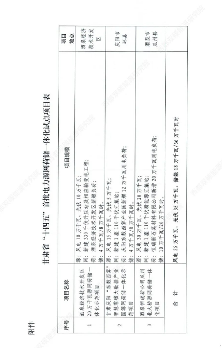 根據(jù)文件,酒泉經(jīng)濟(jì)技術(shù)開發(fā)區(qū)20 萬(wàn)千瓦源網(wǎng)荷儲(chǔ)一體化示范項(xiàng)目、甘肅慶陽(yáng)“東數(shù)西算”智慧零碳大數(shù)據(jù)產(chǎn)業(yè)園源網(wǎng)荷儲(chǔ)一體化示范項(xiàng)目、酒泉恒瑞新公司瓜州北大橋源網(wǎng)荷儲(chǔ)一體化項(xiàng)目等3個(gè)項(xiàng)目建設(shè)方案總體符合國(guó)家相關(guān)要求,同意列為甘肅省“十四五”首批電力源網(wǎng)荷儲(chǔ)一體化試點(diǎn)項(xiàng)目,其中風(fēng)電55萬(wàn)千瓦,光伏35萬(wàn)千瓦,儲(chǔ)能18萬(wàn)千瓦/36萬(wàn)千瓦時(shí)。