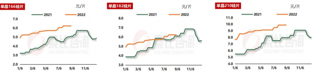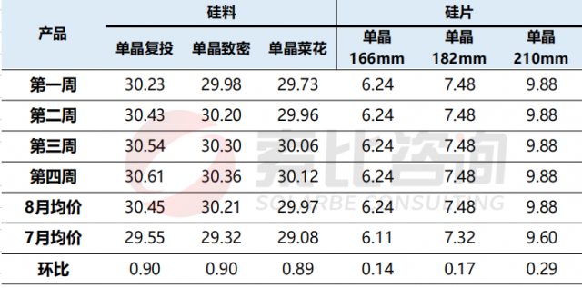 根據(jù)索比咨詢對多家硅片制造商的調研:就8月硅片價格行情來看,單晶166mm均價漲至6.24元/片,較7月環(huán)比上升2.1%;單晶182mm均價漲至7.48元/片,較7月環(huán)比上漲2.2%;單晶210mm均價漲至9.88元/W,較7月環(huán)比上升2.9%。