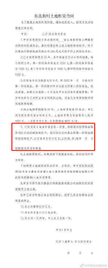 但是根據(jù)一份在網(wǎng)絡(luò)上流傳、未簽訂土地租賃合同文件,“已經(jīng)流轉(zhuǎn)土地由村委會(huì)統(tǒng)一經(jīng)營,流轉(zhuǎn)期內(nèi)按照每畝每年660元返還被流轉(zhuǎn)農(nóng)戶”。