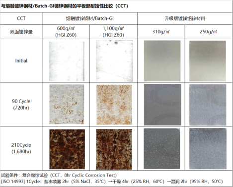 革新后的鍍鎂鋁鋅板與相同鍍鋅附著量的普通熔融鍍鋅鋼板(GI, GI(H))相比具有10倍以上耐蝕性的產(chǎn)品,與現(xiàn)有市面上普遍使用的鍍鋅材料產(chǎn)品相比,在平板部位表現(xiàn)出2倍的優(yōu)異耐蝕性。