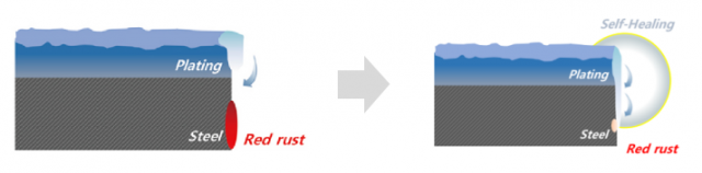 革新后的鍍鎂鋁鋅板在截面產(chǎn)生時(shí),材料上部的鍍鋅層溶解并使截面被覆蓋,促進(jìn)穩(wěn)定的腐蝕生成物的生長(zhǎng)。通過(guò)增加鍍層內(nèi)的Mg含量(%)及確保與Al含量(%)的最佳平衡,在促成切面部位優(yōu)越的的MgZn2腐蝕生成物增大的同時(shí),也使其更加致密、堅(jiān)固,進(jìn)而加快耐腐蝕屏障(Self-Healing Zone)生成的速度,因此在自愈效果上與常用的高耐腐蝕鍍鋅鋼板相比,產(chǎn)生了明顯的差異。