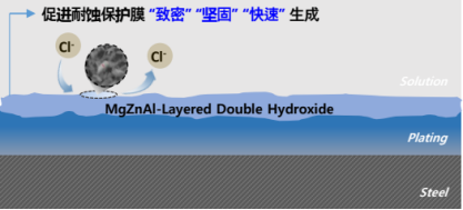 市面上普遍使用的鍍鋅材料,其耐蝕原理是在氧化過(guò)程中生成包含多個(gè)氣孔的飽和氧化皮膜層,隨著腐蝕因子(氧、水分、鹽分等)對(duì)氧化皮膜層的不斷侵蝕,表面鋅層厚度也不斷損耗,因此產(chǎn)品壽命受到極大影響。而這種革新性材料,其鍍層中的鎂(Mg)會(huì)促進(jìn)非常穩(wěn)定狀態(tài)的致密腐蝕生成物L(fēng)DH(Layered Double Hydroxide,層狀雙氫氧化物),再基于LDH形成全面的屏障并推遲腐蝕的發(fā)生,幾乎不發(fā)生損耗。