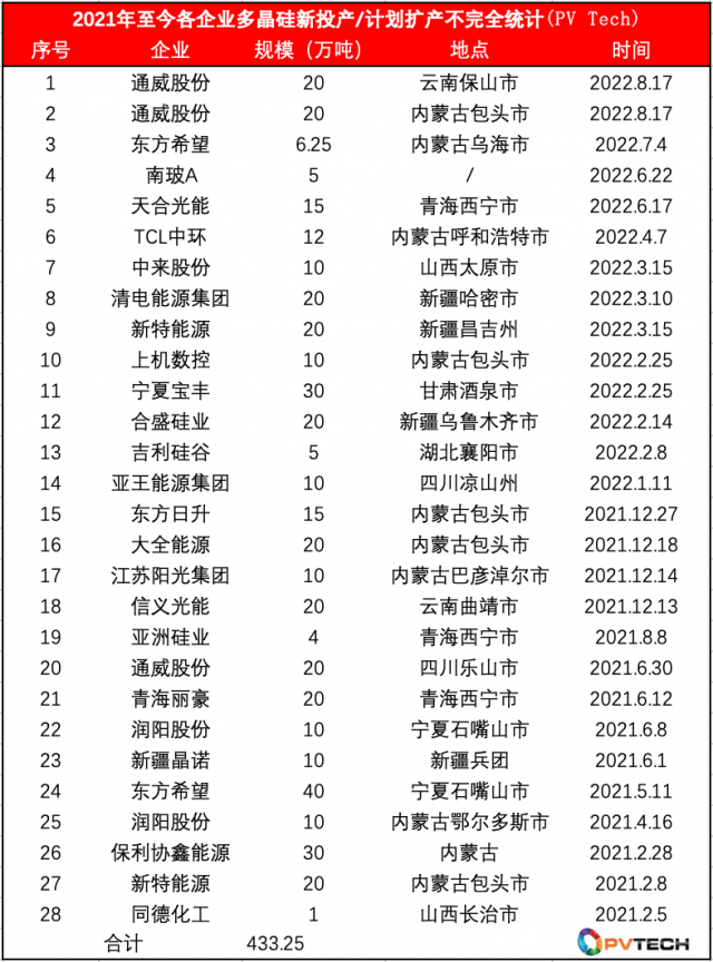 2021年至今各企業(yè)多晶硅新投產(chǎn)/計劃擴產(chǎn)不完全匯總(PV Tech)