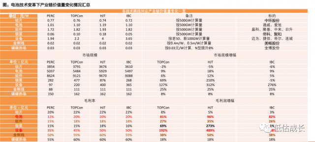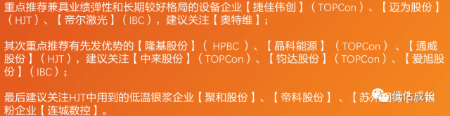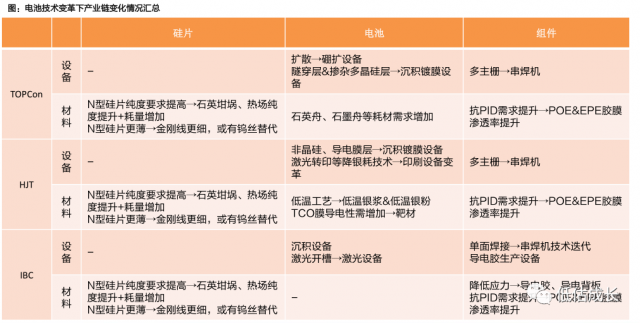 核心結論為:短期TOPCon與P型IBC具有優(yōu)勢,中期TOPCon、HJT、IBC或將共存,長期預計將往TBC&HBC轉型;新技術變化下,較看好設備、電池組件、銀漿&銀粉。