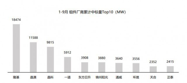 ?圖:據(jù)公開(kāi)數(shù)據(jù)統(tǒng)計(jì),2022年1-9月組件廠商累計(jì)中標(biāo)量(MW)
