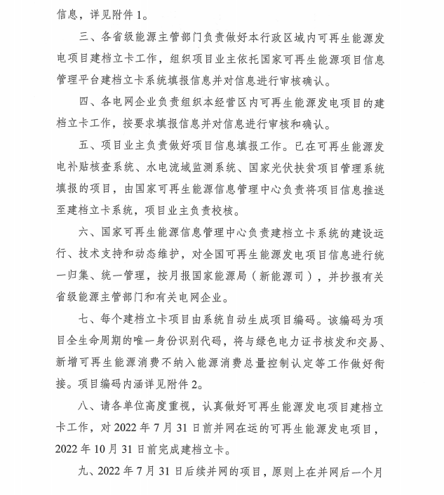 對2022年7月31 日前并網(wǎng)在運(yùn)的可再生能源發(fā)電項(xiàng)目,2022 年10月31日前完成建檔立卡。