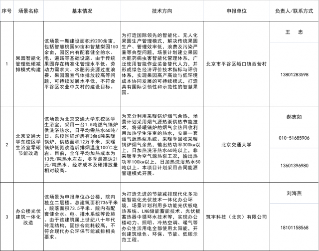 為推進(jìn)本市構(gòu)建市場(chǎng)導(dǎo)向的綠色技術(shù)創(chuàng)新體系工作,根據(jù)《北京市關(guān)于進(jìn)一步完善市場(chǎng)導(dǎo)向的綠色技術(shù)創(chuàng)新體系若干措施》(京發(fā)改〔2021〕1411號(hào),以下簡稱《若干措施》)、《北京市創(chuàng)新型綠色技術(shù)及示范應(yīng)用項(xiàng)目征集遴選管理細(xì)則》(京發(fā)改規(guī)〔2021〕9號(hào)),我們組織開展了創(chuàng)新型綠色技術(shù)應(yīng)用場(chǎng)景征集工作。經(jīng)公開征集、資料審核和現(xiàn)場(chǎng)調(diào)研,現(xiàn)發(fā)布第一批創(chuàng)新型綠色技術(shù)應(yīng)用場(chǎng)景。若有意愿在上述應(yīng)用場(chǎng)景開展技術(shù)應(yīng)用的單位,可與應(yīng)用場(chǎng)景負(fù)責(zé)人聯(lián)系,自行溝通協(xié)商后續(xù)合作工作。后期,我們將持續(xù)跟蹤應(yīng)用場(chǎng)景技術(shù)應(yīng)用情況,并按照《若干措施》要求,對(duì)符合條件的技術(shù)應(yīng)用效果第三方評(píng)價(jià)進(jìn)行支持。