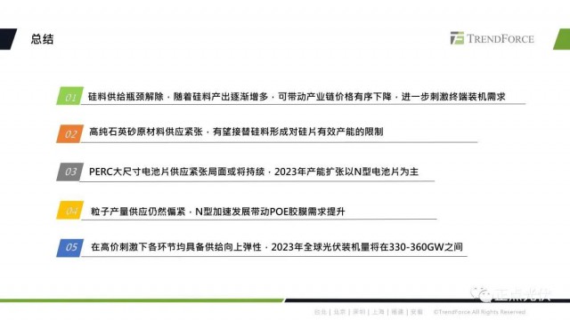 首先對產(chǎn)業(yè)鏈各環(huán)節(jié)2023年的市場量以及光伏裝機量進行預(yù)估。從數(shù)據(jù)上看,2023年硅料整體供應(yīng)充足,不再是制約產(chǎn)業(yè)發(fā)展的瓶頸環(huán)節(jié)。硅片端因為高純石英砂的供應(yīng)偏緊,從而造成了坩鍋產(chǎn)出的受限,這也將影響到硅片的實際產(chǎn)出。電池片環(huán)節(jié)因為2022年下半年以來,新建產(chǎn)能主要還是以n型技術(shù)為主,新技術(shù)產(chǎn)能釋放具有較大不確定性。PERC的產(chǎn)能擴張?zhí)幱谕顟B(tài),2023年大尺寸PERC電池片或?qū)⒊霈F(xiàn)供需緊平衡的狀態(tài)。主要還是關(guān)注TOPCon電池片的實際產(chǎn)出。膠膜方面,poe粒子目前主要還是依賴進口,隨著n型需求的提升,poe粒子的供應(yīng)端也會較為緊張。但是以上各環(huán)節(jié)在較高的資金刺激下,實際產(chǎn)出都具備了向上的彈性。所以綜合的產(chǎn)業(yè)鏈的實際產(chǎn)出數(shù)據(jù),我們預(yù)計2023年全球裝機量將在330-360GW之間。