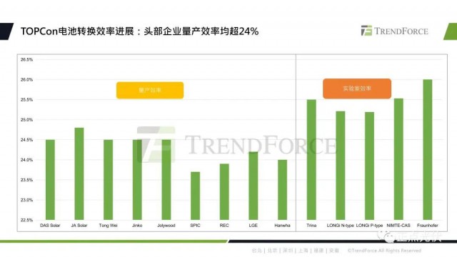 當(dāng)前,TOPCon頭部企業(yè)的量產(chǎn)效率都突破了24%,比PERC平均要高0.5%-0.8%,2023年的量產(chǎn)效率也有望朝著24.5%-25%邁進。TOPCon的實驗室轉(zhuǎn)換效率目前都超過了25%,今年的四月份晶科公布了182版型的n型TOPCon電池片的轉(zhuǎn)換效率,已經(jīng)達到了25.7%,打破新的記錄。
