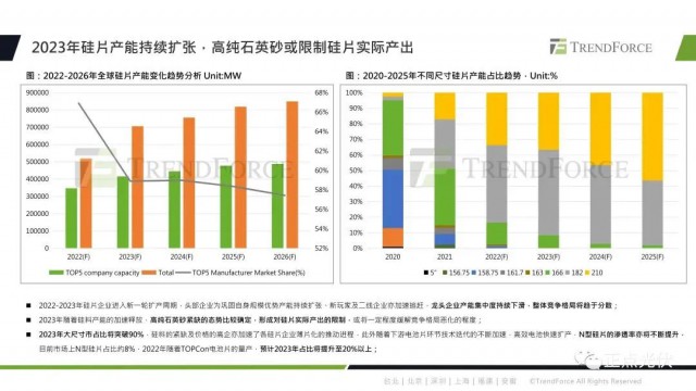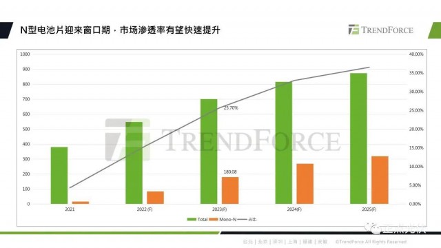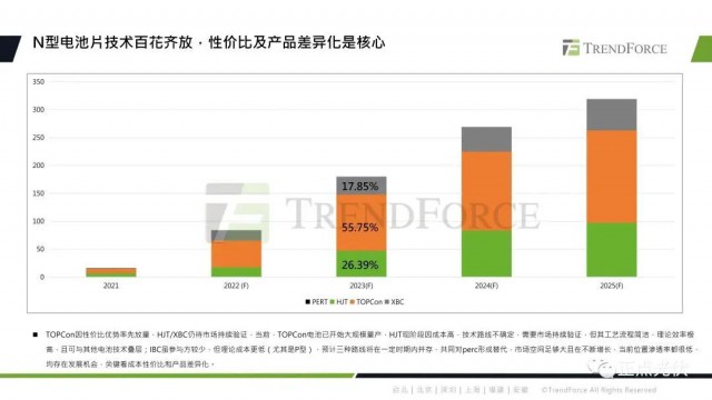 TOPCon因為它的性價比優(yōu)勢,實現(xiàn)了率先放量。預(yù)計到2023年底,N型電池片的產(chǎn)能將達到180GW,占比約為25.7%。