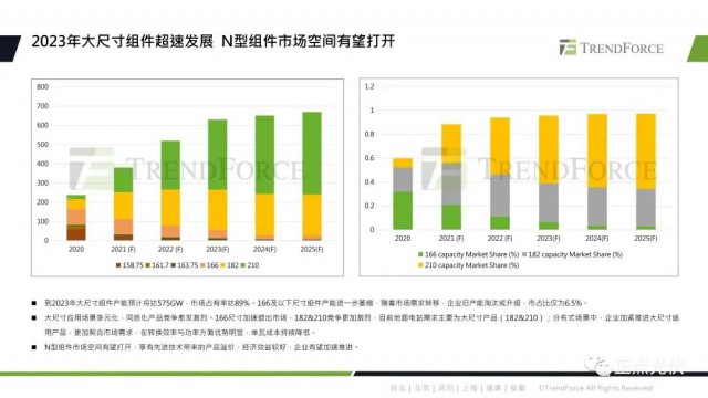 到2023年大尺寸組件產(chǎn)能預(yù)計575GW,市場占有率達89%,166及以下尺寸組件產(chǎn)品進一步萎縮,隨著市場需求轉(zhuǎn)移,企業(yè)舊產(chǎn)能淘汰升級,166市占比僅為6.5%。大尺寸應(yīng)用場景多元化,地面電站的應(yīng)用主要以大尺寸為主,在分布式中企業(yè)也在推進大尺寸的應(yīng)用,以適應(yīng)市場需求。N型組件因為享有先進技術(shù)帶來的產(chǎn)品溢價,經(jīng)濟效益較好,企業(yè)有望加速推進。