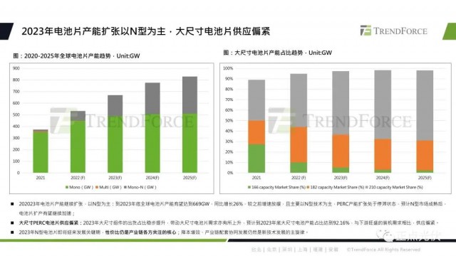 電池片環(huán)節(jié)。2023年電池片產(chǎn)能繼續(xù)擴張,主要以N型為主。到2023年底,全球電池片產(chǎn)能有望達到669GW,同比增長26%,對比之前增速是在放緩的。等到N型市場成熟,電池片的產(chǎn)能有望繼續(xù)擴張。大尺寸PERC電池片的供應(yīng)會偏緊。2023年大尺寸組件的出貨占比穩(wěn)步提升,這也將帶動大尺寸電池片需求的上升,預(yù)計到2023年底,大尺寸電池產(chǎn)能占比達到92%。目前因為擴展產(chǎn)能主要以N型為主,PERC電池片的產(chǎn)能擴張?zhí)幵谕臓顟B(tài),與下游旺盛的裝機需求相比,大尺寸PERC電池片的供應(yīng)將偏緊。2023年N型電池片即將迎來發(fā)展的關(guān)鍵期,性價比是各方面關(guān)注的核心,降本增效、產(chǎn)業(yè)鏈配套協(xié)同發(fā)展仍然是新技術(shù)發(fā)展主旋律。