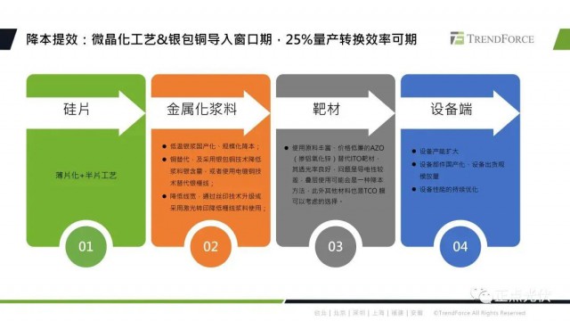 目前HJT技術(shù)降本增效的路徑還是比較確定的,硅片端主要是薄片化以及半片工藝的發(fā)展,金屬化漿料方面,包括低溫銀漿的國產(chǎn)化、規(guī)?;当?銀包銅、電鍍銅上降低銀漿的耗量,靶材價格以及用量的下降,還有設(shè)備國產(chǎn)化、規(guī)?;当镜确矫妗?/p>