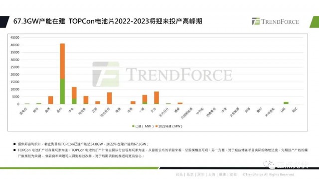 具體來看TOPCon技術(shù)的產(chǎn)能進展與效率方面。據(jù)統(tǒng)計,截止到目前,TOPCon的已建產(chǎn)能大約是在34.8GW,2022年再建產(chǎn)能約為67.3GW。從目前公布的項目來看,規(guī)模還是十分可觀的。目前TOPCon電池的擴產(chǎn)還是以存量玩家為主,儲備項目前期投產(chǎn)的量產(chǎn)數(shù)據(jù)會比較關(guān)鍵,如果良率方面的問題可以得到有效的改善,后期項目的推進將會更有信心。