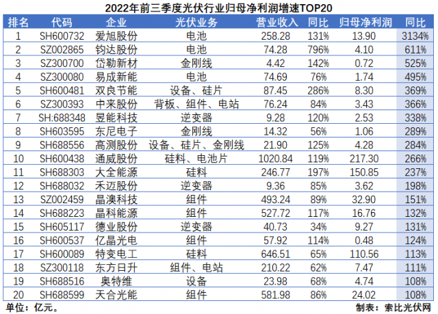 2022年前三季度,在整個A股市場一片“哀嚎”之際,光伏行業(yè)依然延續(xù)高速增長態(tài)勢。根據(jù)索比光伏網(wǎng)的統(tǒng)計數(shù)據(jù)顯示,80家光伏概念股營收增速和歸母凈利潤增速中值分別達(dá)到51%和40%;營業(yè)收入和歸母凈利潤呈增長態(tài)勢的企業(yè)分別達(dá)到71家和57家,占比高達(dá)89%和71%。