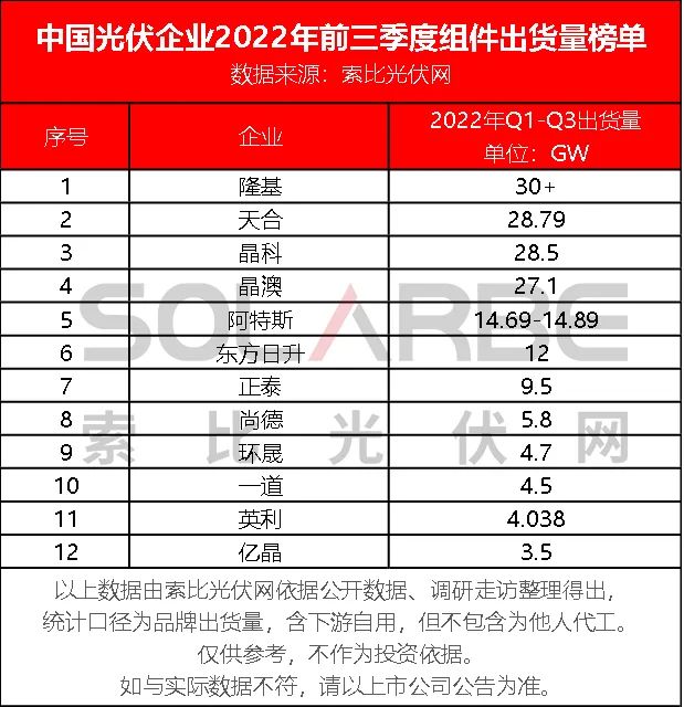 經(jīng)過(guò)索比光伏網(wǎng)多次調(diào)研走訪,結(jié)合相關(guān)企業(yè)財(cái)報(bào)、投資者活動(dòng)記錄、招投標(biāo)信息等,我們整理了中國(guó)光伏企業(yè)2022年前三季度組件出貨量榜單,詳情如下: