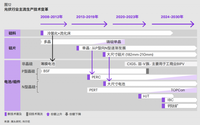其一,單瓦組件成本長期將逐步下降,主要得益于技術(shù)演進(jìn)帶來的轉(zhuǎn)換效率提升。電池組件主流技術(shù)正在快速演進(jìn)迭 代( 如 圖 12),已 經(jīng) 從 傳 統(tǒng) P 型 向 PERC+ 和 N 型TOPCon 及 HJT 發(fā)展,未來隨著新型技術(shù)的發(fā)展,如具備成本優(yōu)勢的鈣鈦礦在突破穩(wěn)定性瓶頸后、其疊層電池大幅提升太陽光利用水平,將有可能進(jìn)一步大幅降低降低單位成本。同時(shí),隨規(guī)模效應(yīng)顯現(xiàn),單位產(chǎn)線投資成本下降以及人均產(chǎn)出率提升將進(jìn)一步拉低電池組件成本。