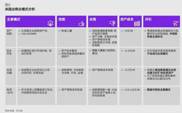 央國企更多考慮如何能更快速持有優(yōu)質(zhì)資產(chǎn),資產(chǎn)收購仍舊會(huì)是中短期的主流模式(如圖 6)??紤]到央國企的指標(biāo)壓力和集中式光伏的經(jīng)驗(yàn),通過從民營企業(yè)收購資產(chǎn)包能夠幫助其實(shí)現(xiàn)快速上量。但同時(shí)該模式存在諸多劣勢:例如資產(chǎn)分散且品質(zhì)不理想、資產(chǎn)獲取成本高、信息透明度有限、賣方話語權(quán)過高等問題。為完成國家任務(wù)指標(biāo),近年來央國企也試探性推進(jìn)資產(chǎn)成本更低的自建團(tuán)隊(duì)開發(fā)模式,但由于需要大量能力與團(tuán)隊(duì)建設(shè),自主開發(fā)暫不會(huì)不會(huì)成為主流模式。