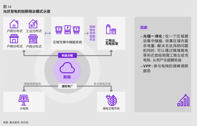 一邊是消納困局、一邊是電價(jià)短期波動(dòng)風(fēng)險(xiǎn),戶用光伏發(fā)電正經(jīng)歷著來自市場的新考驗(yàn)。結(jié)合光伏發(fā)電商業(yè)模式判斷,未來光儲(chǔ)一體化和虛擬電網(wǎng)兩種創(chuàng)新模式的發(fā)展或成為針對上述挑戰(zhàn)的最優(yōu)解法(如圖 14)。