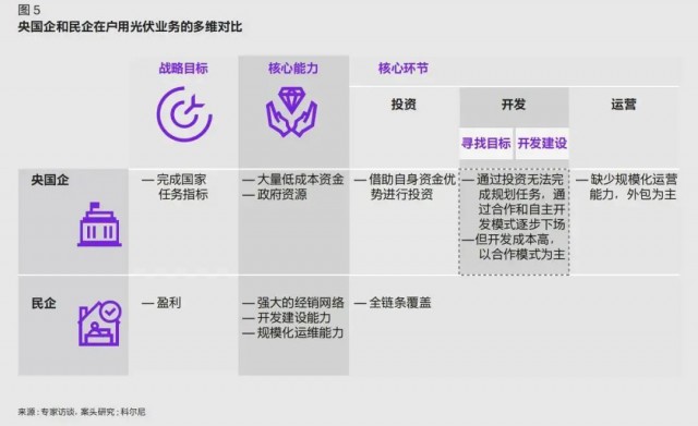 由于央國企和民營企業(yè)對于戶用光伏的戰(zhàn)略定位、切入賽道和自身能力均不同,因此其各自具備獨(dú)特的商業(yè)模式,且在產(chǎn)業(yè)鏈上逐漸形成互補(bǔ)合作的上下游關(guān)系(如圖 5)。