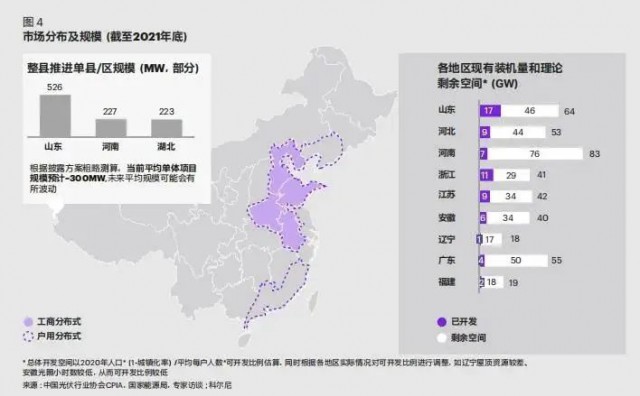 綜合考慮市場空間、綜合條件、產(chǎn)權(quán)模式等因素,科爾尼認(rèn)為山東、河北、河南、浙江、江蘇、安徽、遼寧、廣東與福建為未來整縣推進(jìn)領(lǐng)域的九大高潛力市場。其中,山東、河北、河南地區(qū)雖競爭激烈,但可開發(fā)空間仍十分可觀;浙江、江蘇由于居民投資意識(shí)強(qiáng),整體出售市場更具吸引力;安徽、遼寧、廣東、福建綜合條件優(yōu)勢明顯,建議重點(diǎn)布局。根據(jù)測算,當(dāng)前整縣推進(jìn)的平均單體項(xiàng)目規(guī)模預(yù)計(jì)在300MW 左右(如圖 4)。