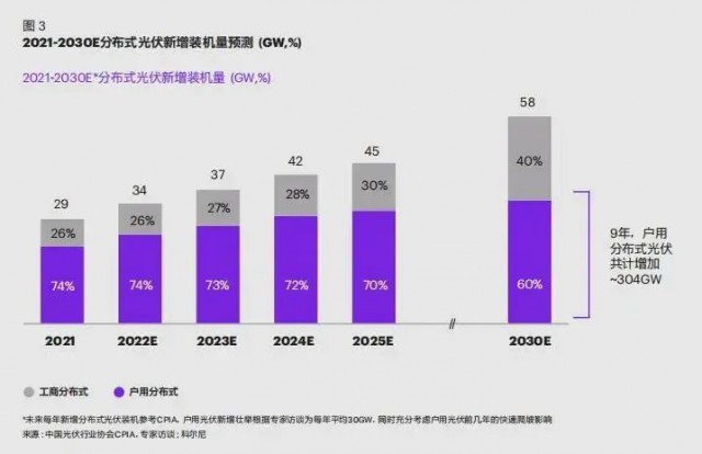 根據(jù)市場趨勢,科爾尼認(rèn)為, 2025 年以前戶用光伏會(huì)在政策和盈利性提升驅(qū)動(dòng)下大幅提速,后期隨著整縣推進(jìn)結(jié)束,預(yù)期 2025-2030 增速會(huì)略有放緩。保守預(yù)計(jì)中國市場到 2030 年將累計(jì)增加戶用光伏超過 300GW,市場空間廣闊(如圖 3)。